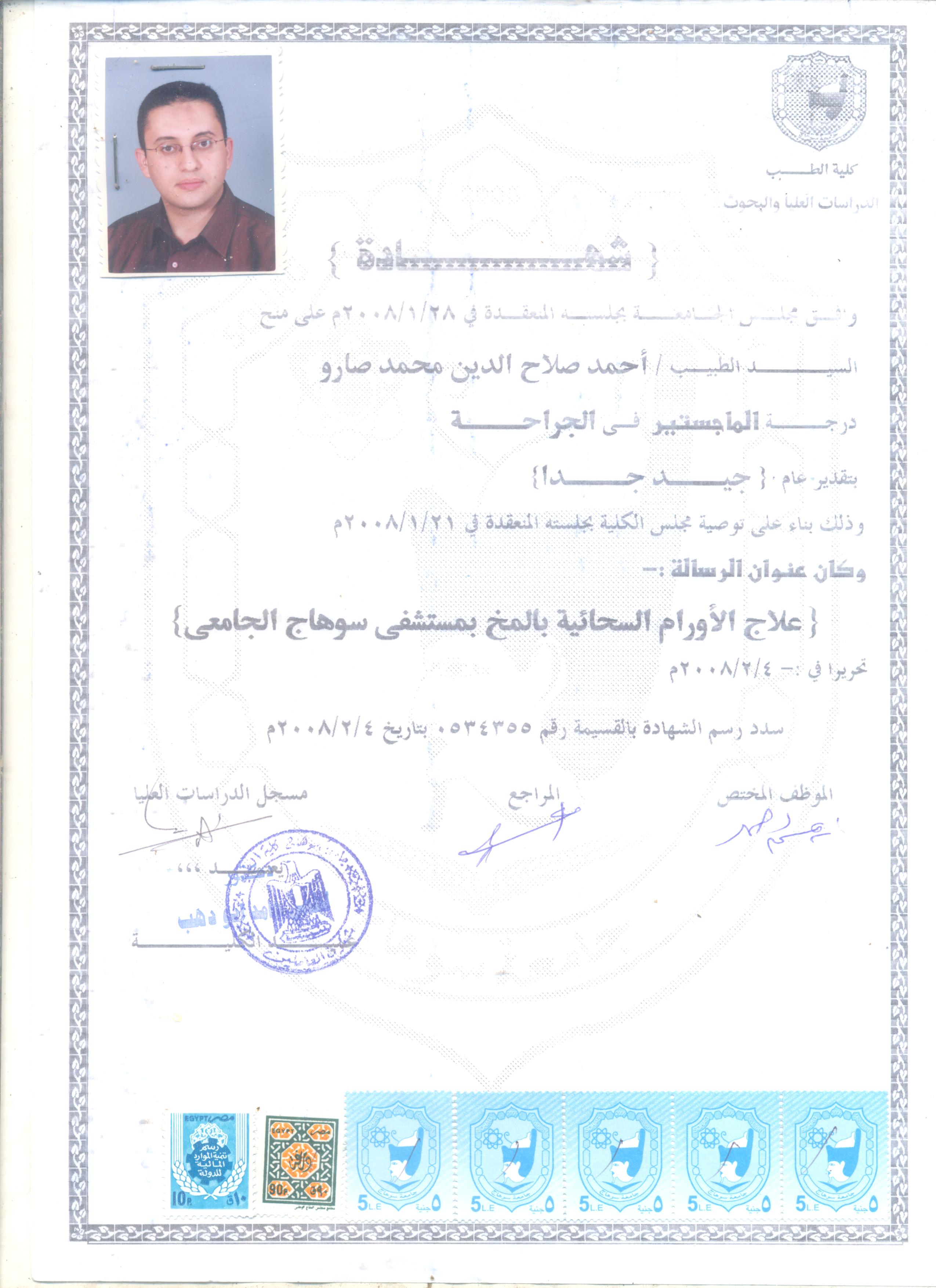 Master Degree in General Surgery: Sohag Faculty of Medicine, South Valley University, Egypt. September, 2006. General grade: Very good.