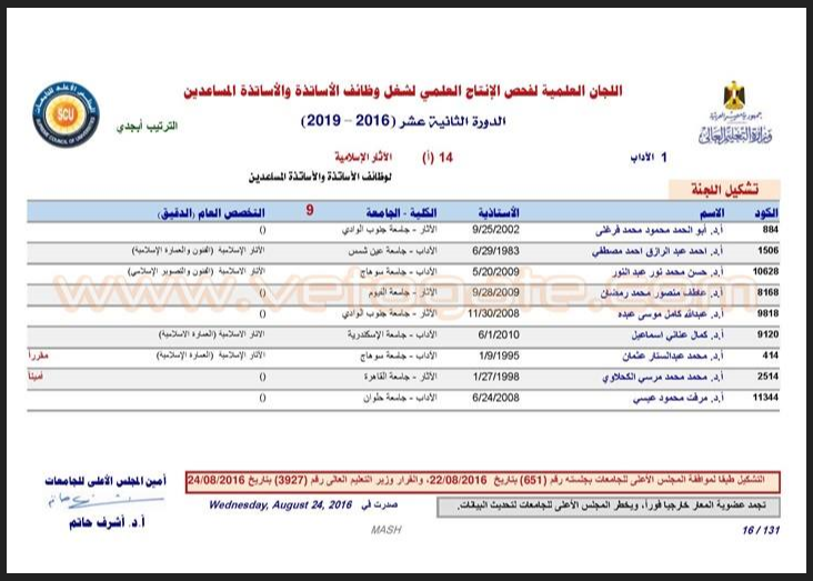 9- أمين اللجنة العلمية ( الخماسية ) لترقية الدكتور/ وائل بكرى رشيدي هاشم المدرس بكلية الآثار بقنا جامعة جنوب الوادى ، والمتقدم للحصول على لقب أستاذ مساعد بتاريخ 1/10/2015م .