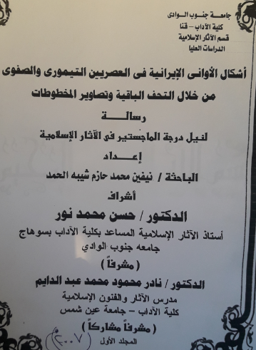 3- أشكال الأواني الايرانية في العصرين التيموري والصفوي من خلال التحف الباقية و تصاوير المخطوطات . رسالة ماجستير نوقشت عام 2007م بقسم الآثار الاسلامية بكلية الآداب جامعة جنوب الوادي ( مشرف رئيسى ) .