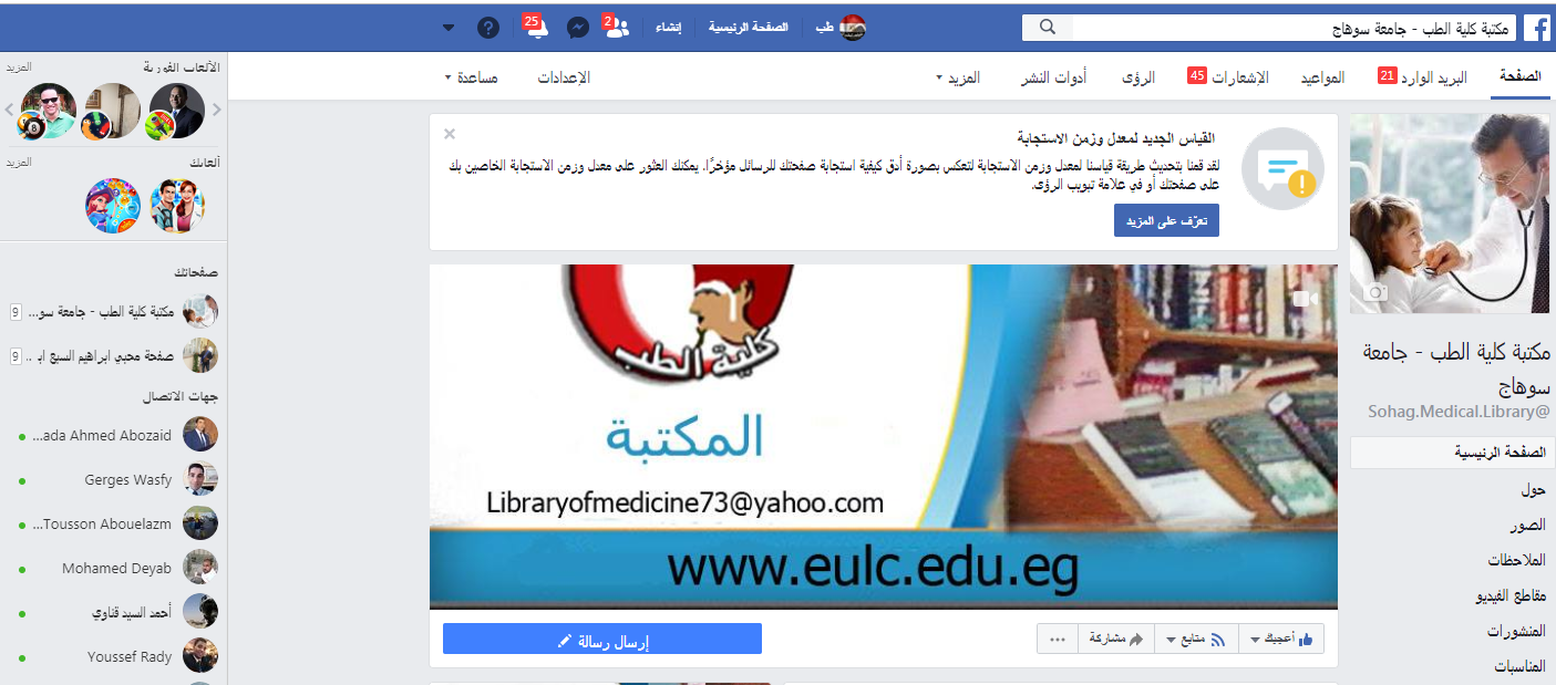يسعد مكتبة كلية الطب البشرى بسوهاج ان تقدم خدماتها على الصفحة الخاصة بها على الفيسبوك على الرابط التالى :https://www.facebook.com/Sohag.Medical.Library/