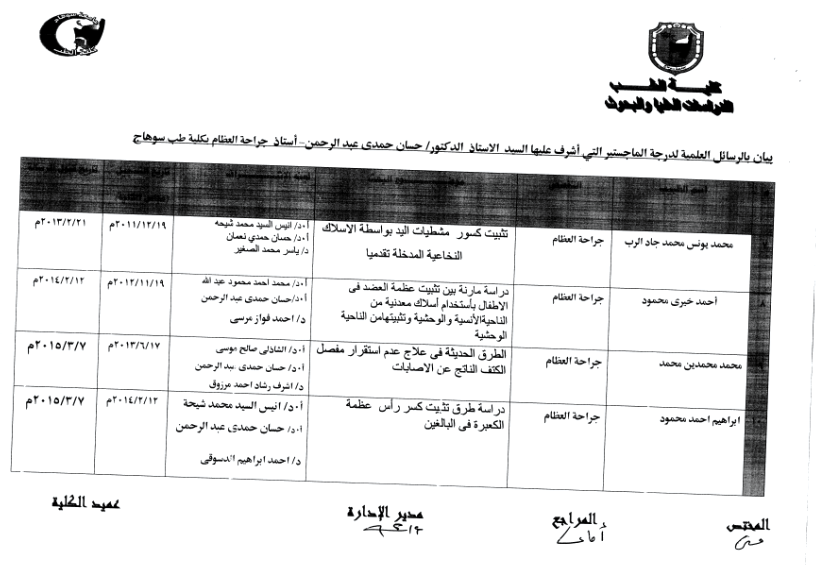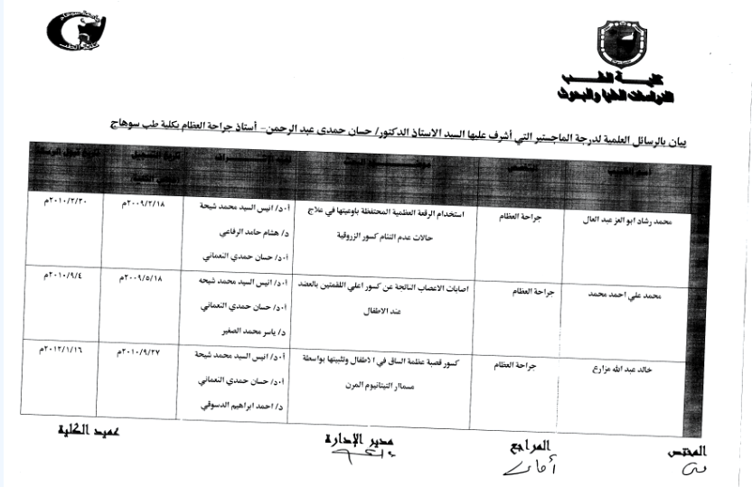 قائمة رسائل الماجستير التى أشرف عليها الأستاذ الدكتور /حسان حمدى عبد الرحمن نعمان منذ 1/4/2005 حتى 18/3/2018
