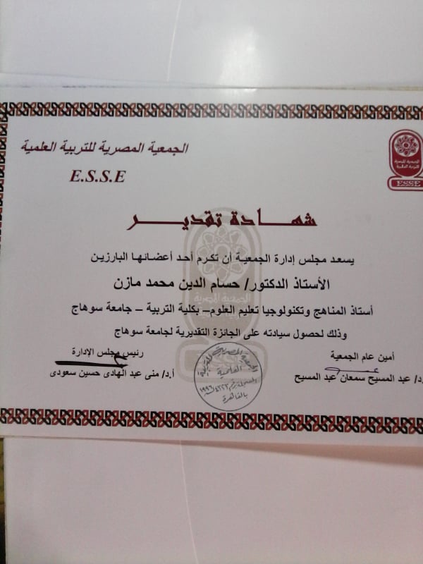 شهادة تقدير من الجمعية المصرية للتربية العلمية بمناسبة حصولى على جامعة سوهاج التقديرية - 2015م