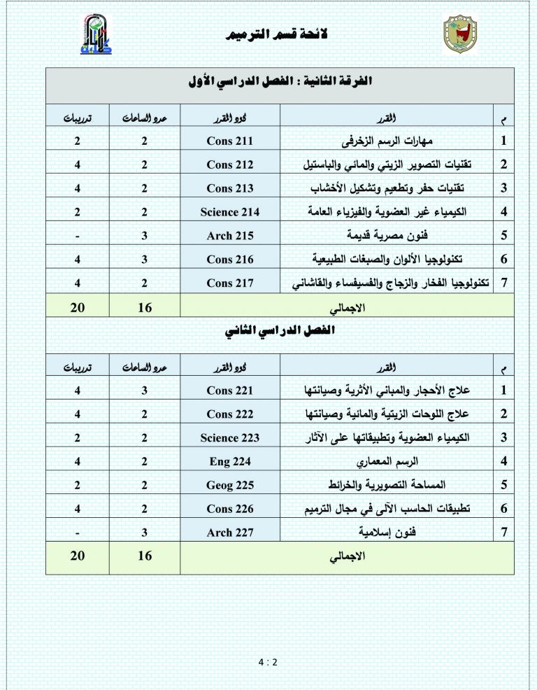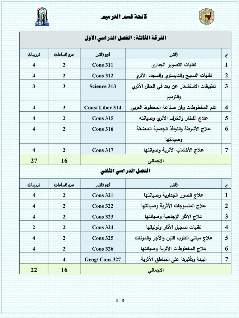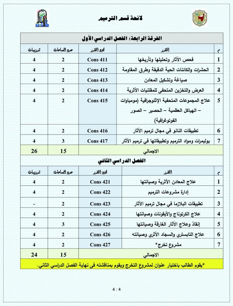 طلاب كلية الآثار قسم ترميم الآثار (المقررات الدراسية خلال الأربع سنوات)