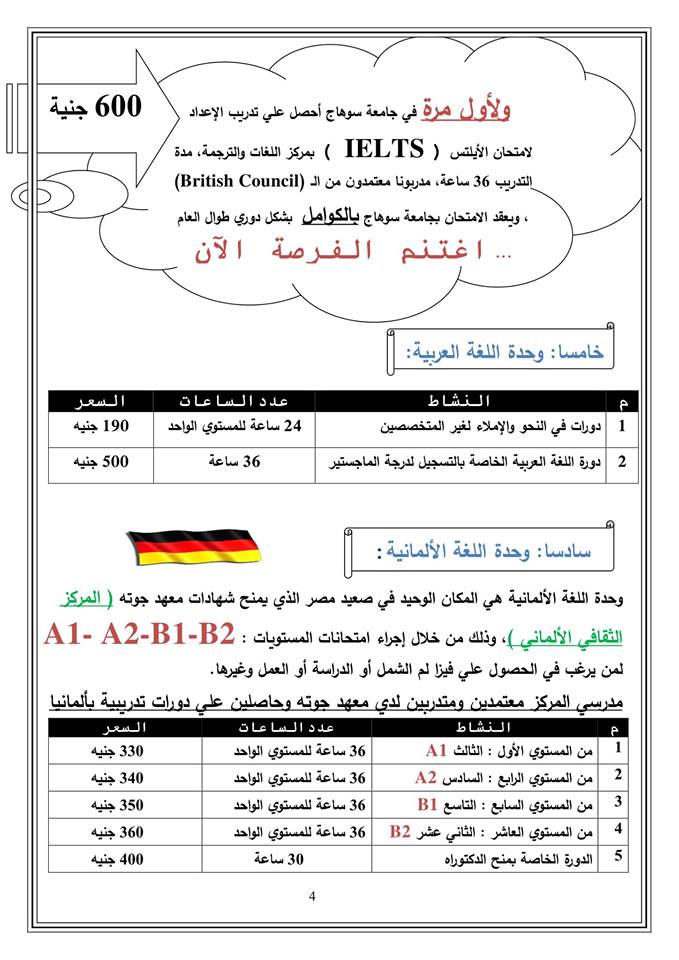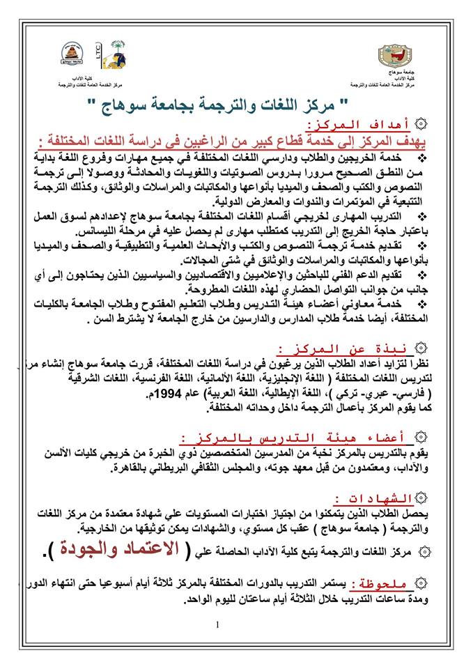 بشري سارة لطلاب جامعة سوهاج وأهالى محافظة سوهاج ....يسر مركز اللغات والترجمة بكلية الآداب المعتمدة من قبل الهيئة القومية للإعتماد والجودة والذى فى سبيله إلى الحصول على الـ ISO أن يعلن عن دورات معتمدة فى اللغات الآتية: