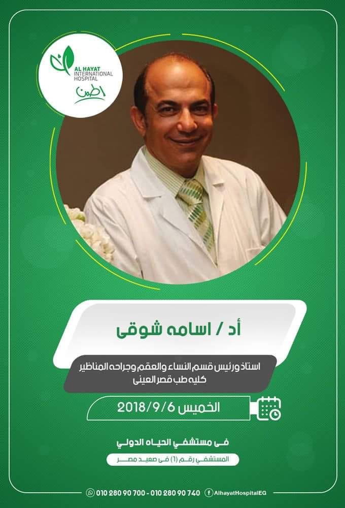 سوف يتم استضافة الأستاذ الدكتور أسامة شوقى استاذ النساء والتوليد بمستشفى الحياة الدولى بسوهاج والذى سوف يقوم بمناظرة العديد من السيدات اللاتي يعانن من تأخر حدوث الحمل بسبب مشاكل داخل الرحم وسوف يقوم بإجراء منظار الرحم التشخيصى والعلاجى لتلك السيدات.