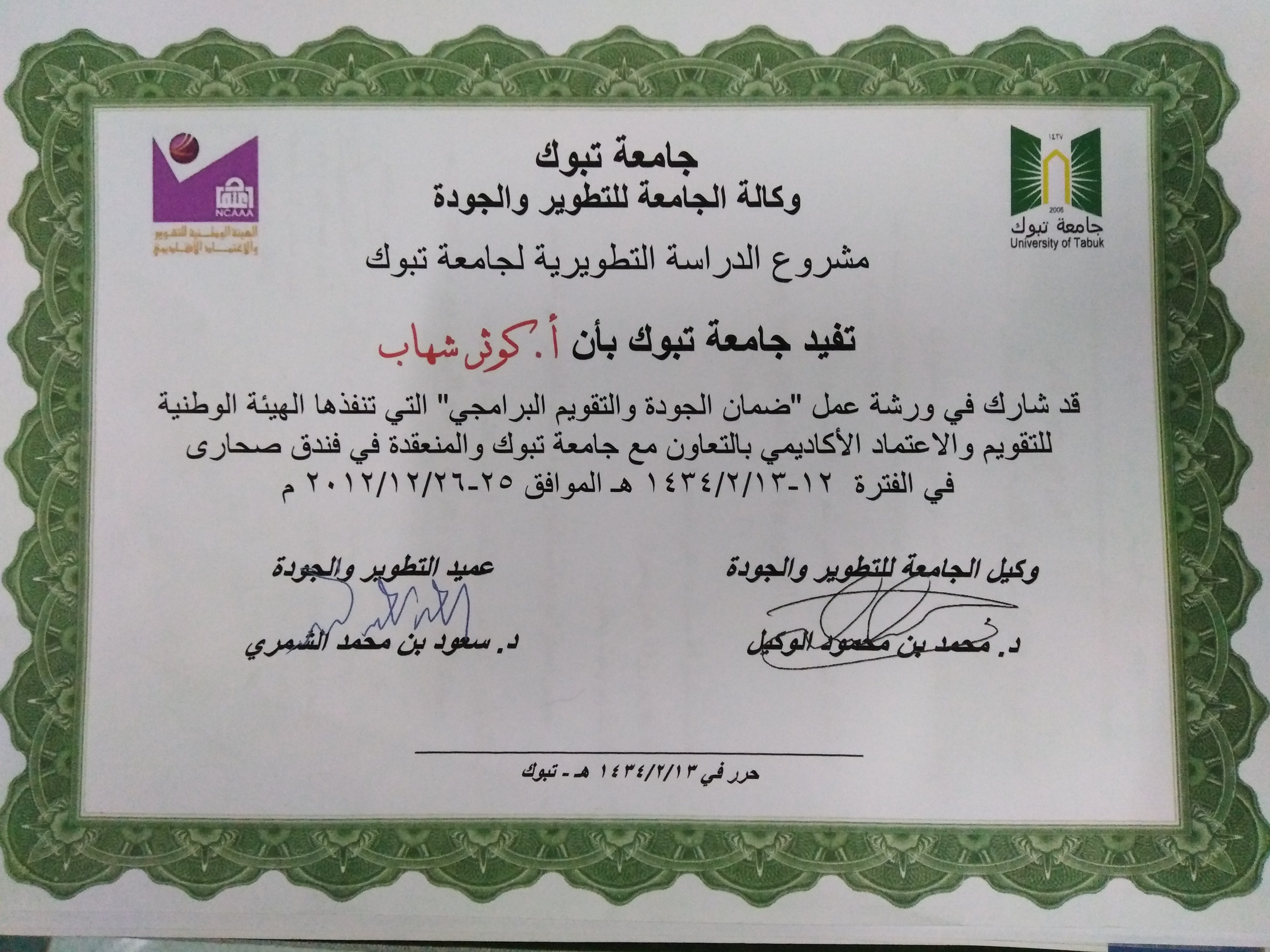لقد حضرت أ.د. كوثر عبد الرحيم شهاب الشريف ورشة عمل بعنوان " ضملن الجودة والتقويم البرامجي"التي نفذتها الهيئة الوطنية للتقويم والاعتماد الأكاديمي بالتعاون مع جامعة تبوك والتي انعقدت في فندق صحاري بمدينة تبوك بالمملكة العربية السعودية في الفترة 12-13 / 2 / 1434 هـ الموافق 25 - 26 /12 /2012 م .
