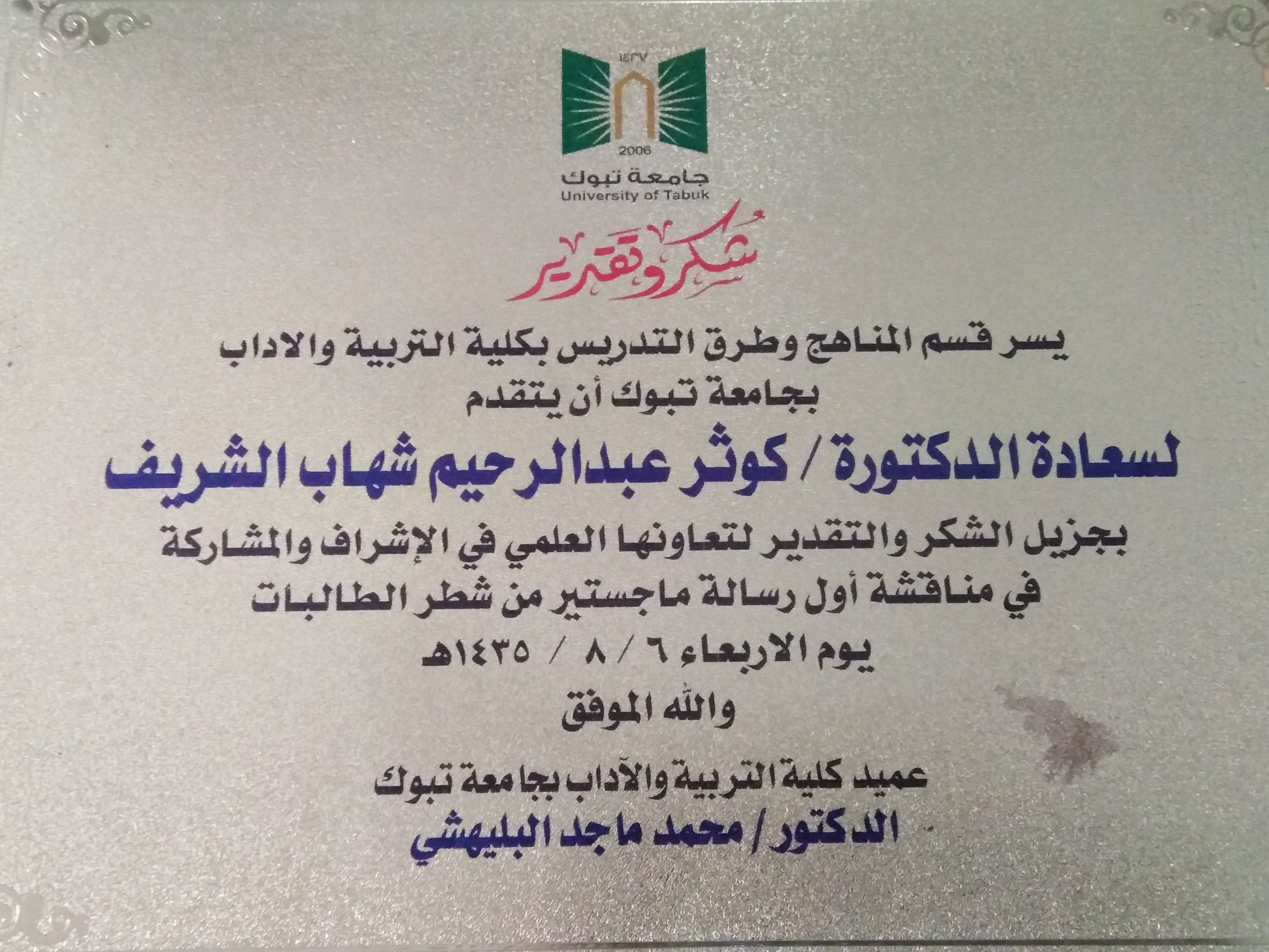 لقد تم تكريم أ.د.كوثر عبد الرحيم شهاب الشريف من قسم المناهج وطرق التدريس بكلية التربية والآداب بجامعة تبوك بالمملكة العربية السعودية وتم تقديم الشكر والتقدير لتعاونها العلمي في الاشراف والمشاركة في مناقشة أول رسالة ماجستير من شطر الطالبات بالكلية ، وقد كانت أ.د.كوثر الشريف مقررا (رئيسا) للجنة المناقشة وذلك في يوم الأربعاء الموافق 6 / 8/ 1435 هـ بمقر جامعة تبوك بالمملكة العربية السعودية .