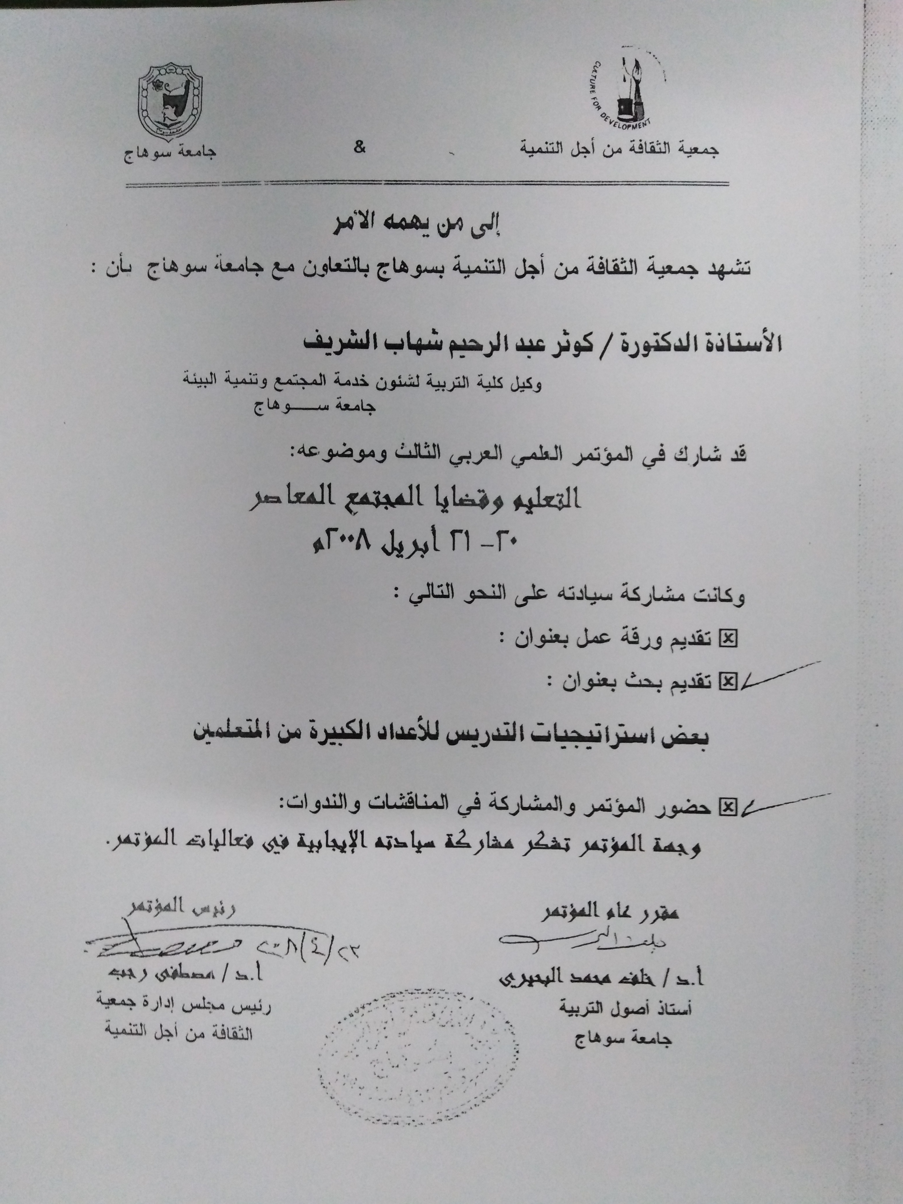 لقد حضرت أ.د.كوثر عبد الرحيم شهاب الشريف المؤتمر العلمي الثالث الذي عقدته جمعية الثقافة من أجل التنمية بالتعاون مع جامعة سوهاج في الفترة 20 - 21 أبريل 2008م وموضوعه " التعليم وقضايا المجتمع " و فيه تم تقديم بحث من أ.د.كوثر الشريف بعنوان " بعض استراتيجيات التدريس للأعداد الكبيرة من المتعلمين ".