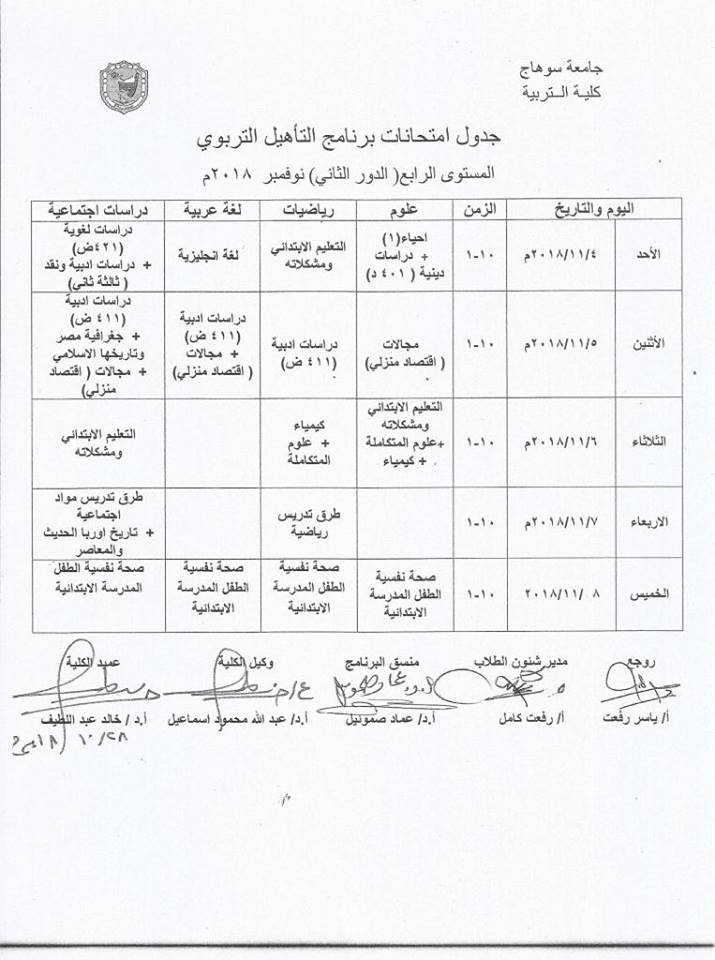 جدول الدور الثاني للمستوي الرابع بالتأهيل التربوي دور نوفمبر 2018م