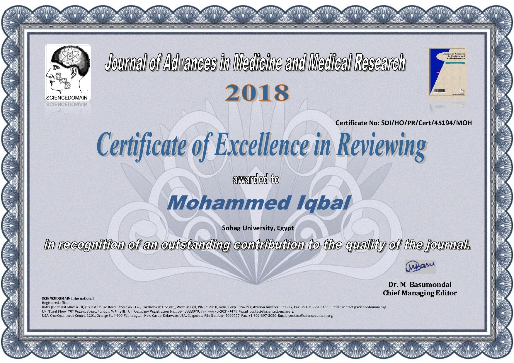 Dr Iqbal recieved scientific reviewer certificate