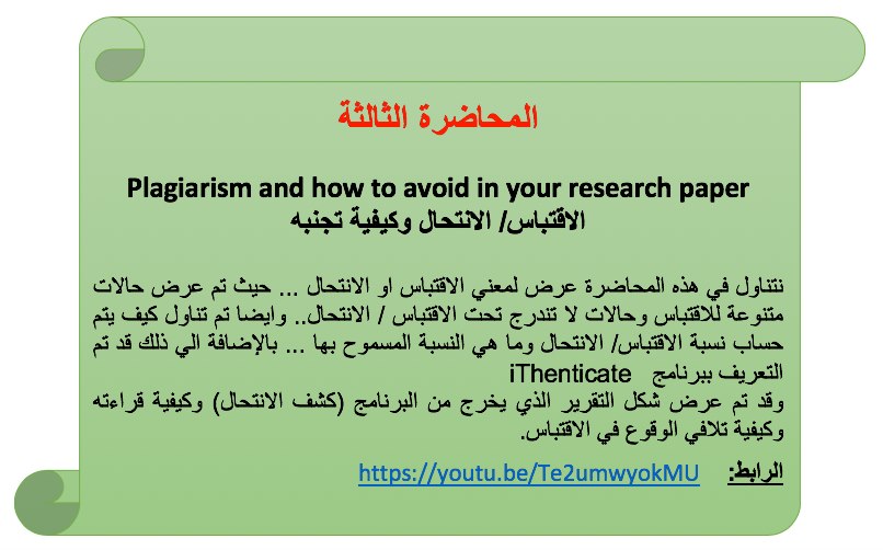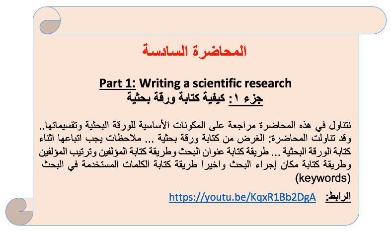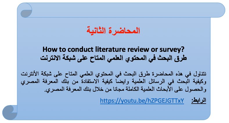 و لكن ما هو الliterature review و ما معني بحث علمي و كيف نبحث في المصادر المتاحة و كيف نكتب البحث و ما هو تقسيمه و كيف نكتب المراجع و ما هو الاقتباس و كيف نتجنبه ... كل هذا موجود في سلسلة محاضرات موجودة علي ال youtube مرفق اللينك للمحاضرات في المرفقات.
