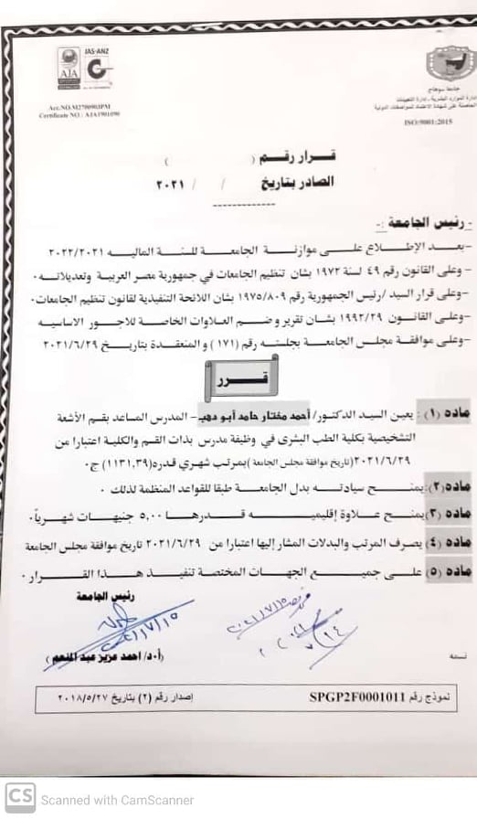 قرار رئيس الجامعة - التعيين كمدرس بقسم الاشعه بتاريخ 29 يونيو 2021