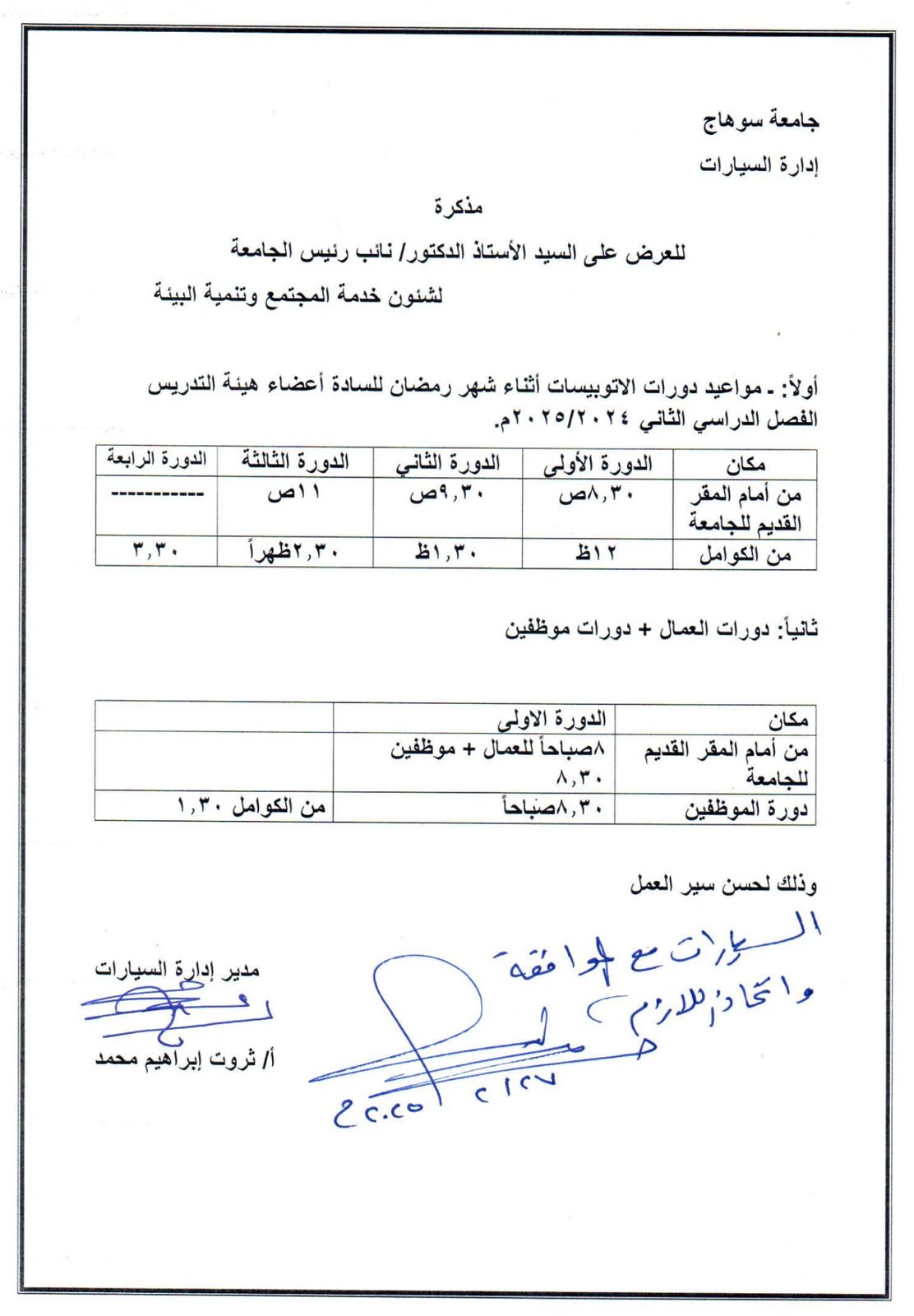 مواعيد دورات أتوبيسات أعضاء هيئة التدربيس بجامعة سوهاج خلال شهر رمضان المبارك 2025م