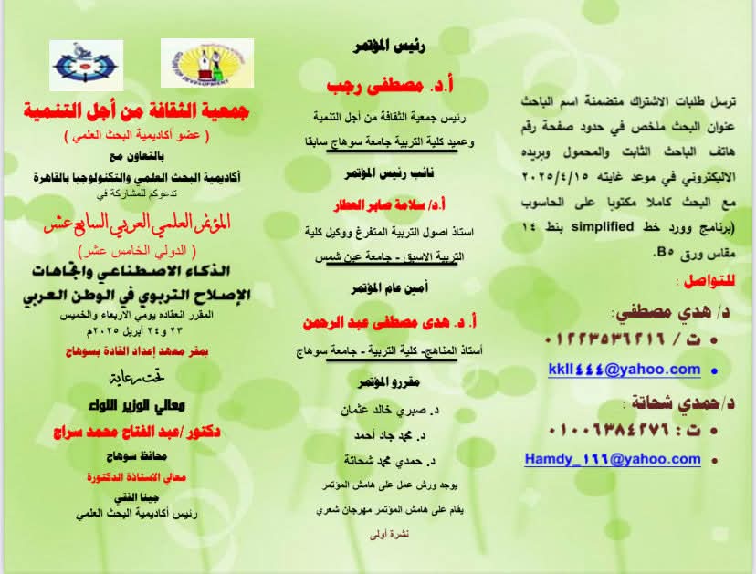 تعقد جمعية الثقافة من أجل التنمية مؤتمرها العلمي السابع عشر الدولي الخامس عشر تحت عنوان: الذكاء الاصطناعي واتجاهات الإصلاح التربوي في الوطن العربي وذلك يومي ٢٣ - ٢٤ / ٤ /٢٠٢٥م