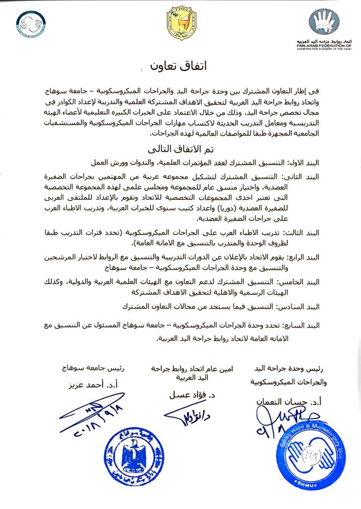 وقع اليوم الدكتور احمد عزيز عبد المنعم رئيس جامعة سوهاج، مع الدكتور فؤاد عسل أمين عام اتحاد روابط جراحة اليد العربية، بروتوكول تعاون مشترك بين وحدة جراحة اليد والجراحات الميكروسكوبية بالجامعة، واتحاد روابط جراحة اليد العربية. وقال الدكتور أحمد عزيز أن هذا التعاون المشترك يهدف الي إعداد كوادر في مجال تخصص جراحة اليد، وذلك من خلال الاعتماد علي خبرات اعضاء هيئة التدريس