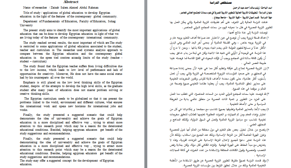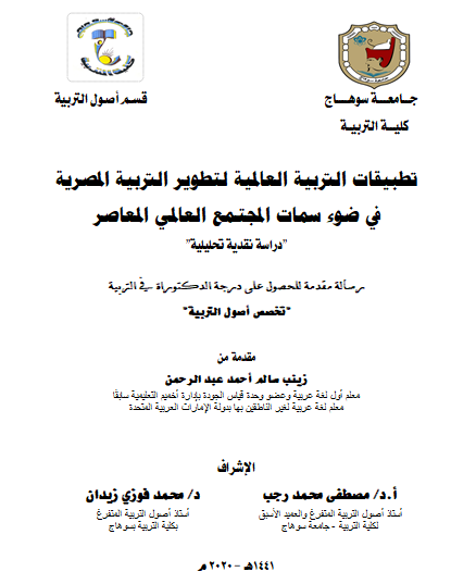 عنوان الدراسة/ تطبيقات التربية العالمية لتطوير التربية المصرية في ضوء سمات المجتمع العالمي المعاصر.