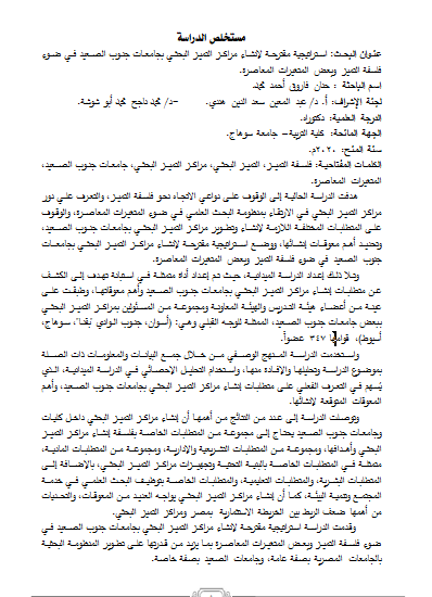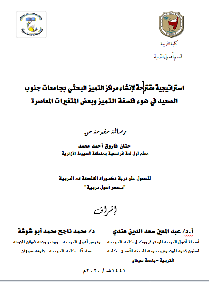 عنوان البحث: استراتيجية مقترحة لإنشاء مراكز التميز البحثي بجامعات جنوب الصعيد في ضوء فلسفة التميز وبعض المتغيرات المعاصرة.