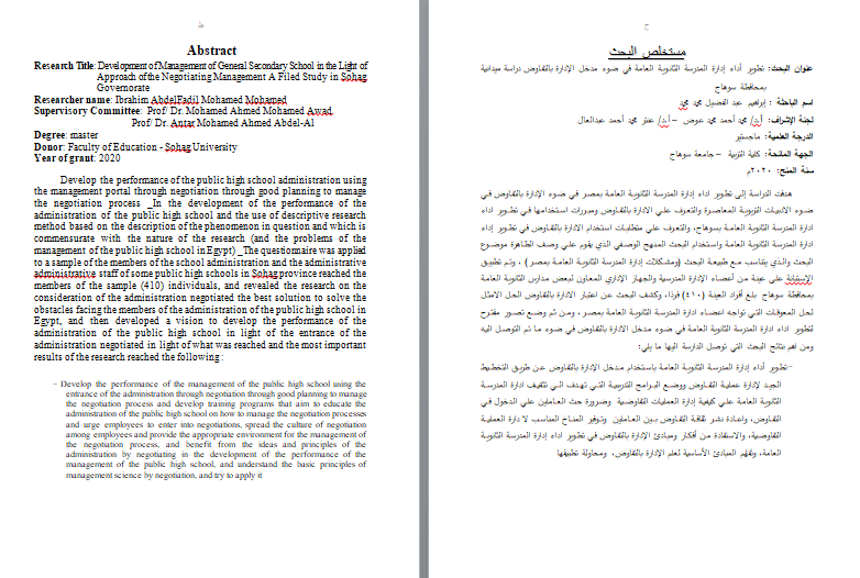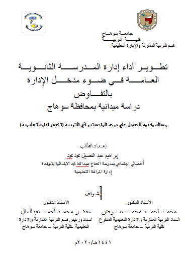 عنوان البحث: تطوير أداء إدارة المدرسة الثانـويـة العامة في ضوء مدخل الإدارة بالتفـاوض دراسة ميدانية بمحافظة سوهاج