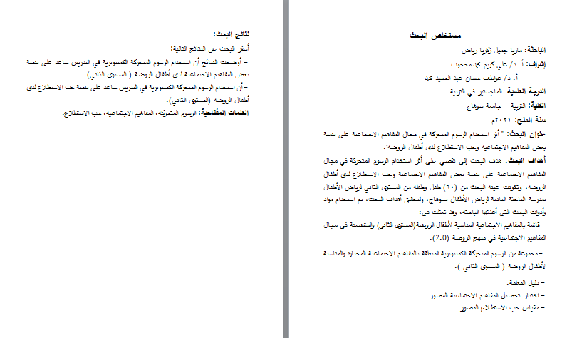 عنوان البحث: " أثر استخدام الرسوم المتحركة في مجال المفاهيم الاجتماعية على تنمية بعض المفاهيم الاجتماعية وحب الاستطلاع لدى أطفال الروضة".