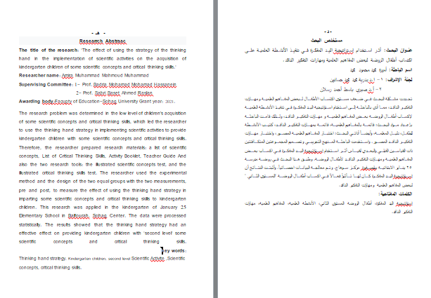 عنوان البحث: أثر استخدام إستراتيجية اليد المفكرة في تنفيذ الأنشطة العلمية على اكتساب أطفال الروضة لبعض المفاهيم العلمية ومهارات التفكير الناقد.