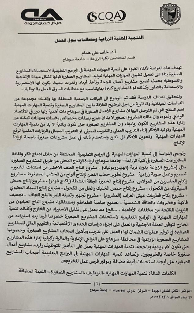 أ.د. خلف على همام - قسم المحاصيل – كلية الزراعة – جامعة سوهاج