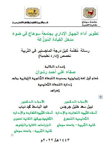 عنوان البحث: تطوير أداء الجهاز الإداري بجامعة سوهاج في ضوء مدخل القيادة المُوزَّعَة.