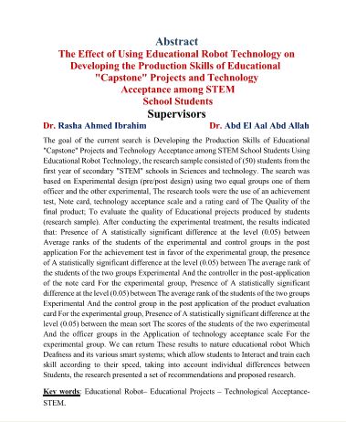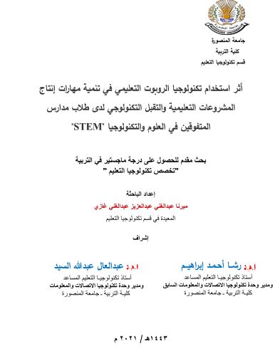 أثر استخدام تكنولوجيا الربوت التعليمي في تنمية مهارات إنتاج المشروعات التعليمية والتقبل التكنولوجي لدي طلاب مدارس المتفوقين في العلوم والتكنولوجيا (STEM)