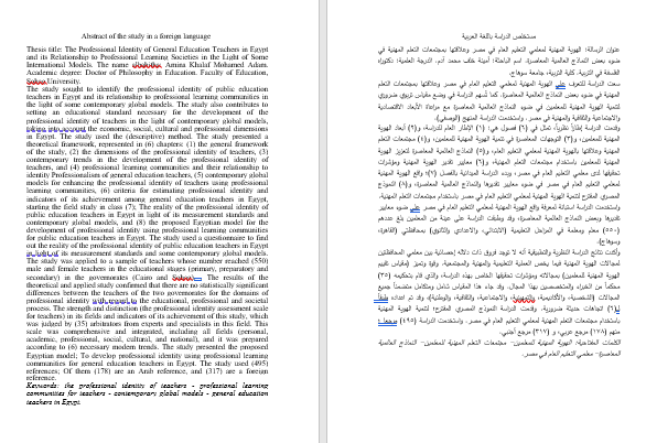 Thesis title: The Professional Identity of General Education Teachers in Egypt and its Relationship to Professional Learning Societies in the Light of Some International Models. The name albahitha: Amina Khalaf Mohamed Adam. Academic degree: Doctor of Philosophy in Education. Faculty of Education, Sohag University.