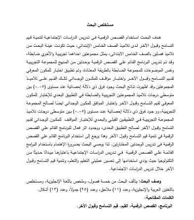فاعلية برنامج قائم علي القصص الرقمية في تدريس الدراسات الاجتماعية لتنمية قيم التسامح وقبول الآخر لدي تلاميذ المرحلة الإبتدائية