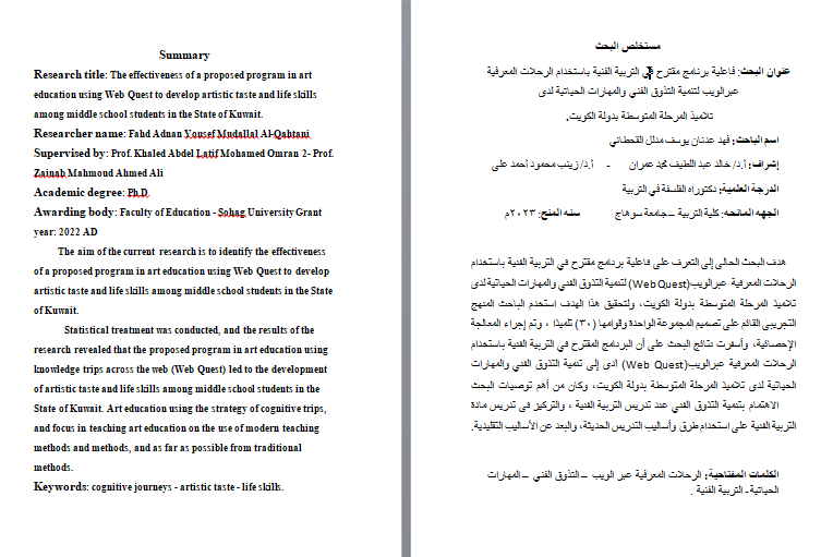Research title: The effectiveness of a proposed program in art education using Web Quest to develop artistic taste and life skills among middle school students in the State of Kuwait.