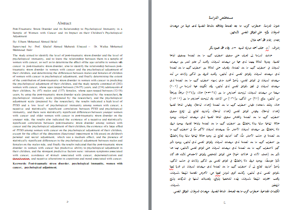 عنوان الدراسة: اضطراب كرب ما بعد الصدمة وعلاقته بالمناعة النفسية لدى عينة من مريضات السرطان وأثره على التوافق النفسي لأبنائهن.