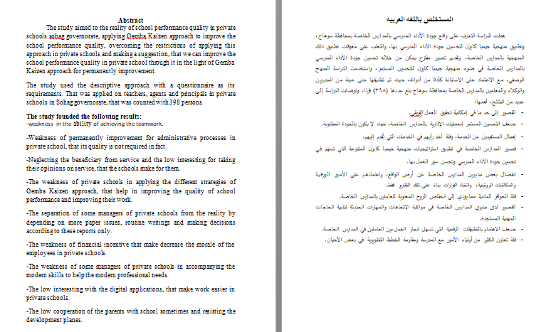 هدفت الدراسة التعرف على واقع جودة الأداء المدرسي بالمدارس الخاصة بمحافظة سوهاج، وتطبيق منهجية جيمبا كايزن لتحسين جودة الأداء المدرسي بها، والتغلب على معوقات تطبيق تلك المنهجية بالمدارس الخاصة، وتقديم تصور مقترح يمكن من خلاله تحسين جودة الأداء المدرسي بالمدارس الخاصة في ضوء منهجية جيمبا كايزن للتحسين المستمر، واستخدمت الدراسة المنهج الوصفي، مع الاعتماد على الاستبانة كأداة من أدواته، حيث تم تطبيقها على عينة من المديرين والوكلاء والمعلمين بالمدارس الخاصة بمحافظة سوهاج بلغ عددها (398) فردًا، وتوصلت الدراسة إلى عديد من النتائج، أهمها: