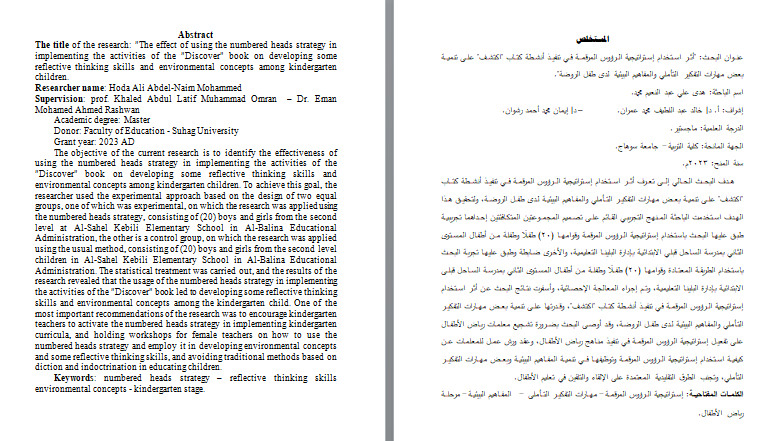 عنوان البحث: "أثر استخدام إستراتيجية الرؤوس المرقمة في تنفيذ أنشطة كتاب "اكتشف" على تنمية بعض مهارات التفكير التأملي والمفاهيم البيئية لدى طفل الروضة".