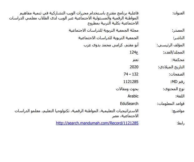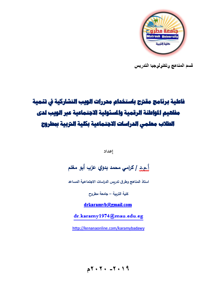 فاعلية برنامج مقترح باستخدام محررات الويب التشاركية في تنمية مفاهيم المواطنة الرقمية والمسئولية الاجتماعية عبر الويب لدى الطلاب معلمي الدراسات الاجتماعية بكلية التربية بمطروح