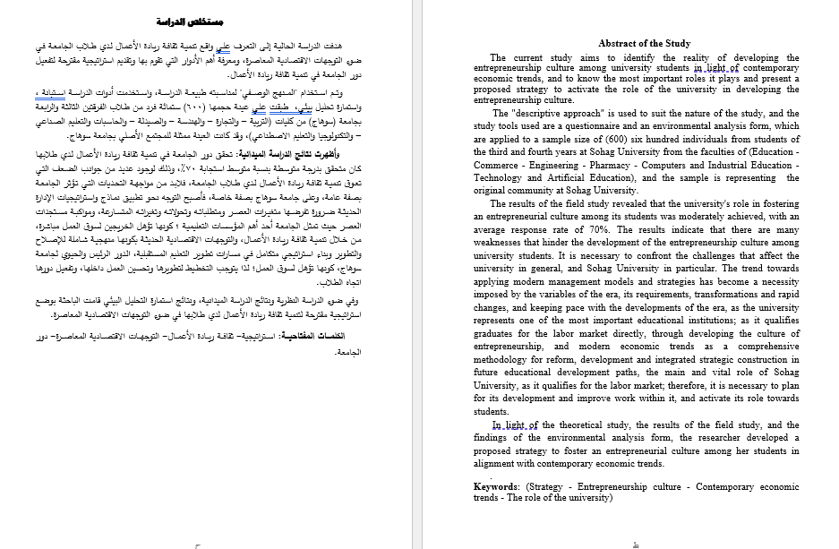 الكلمات المفتاحية: استراتيجية- ثقافة ريادة الأعمال- التوجهات الاقتصادية المعاصرة- دور الجامعة.