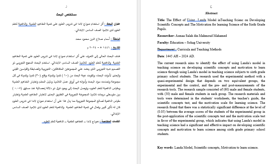 عنوان البحث : أثر استخدام نموذج لاندا فى تدريس العلوم على تنمية المفاهيم العلمية والدافعية لتعلم العلوم لدى تلاميذ الصف السادس الابتدائي.