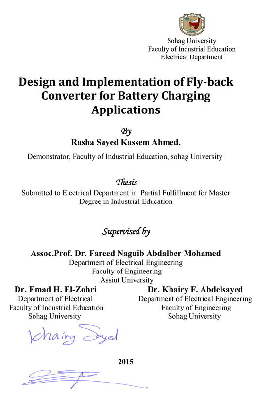 The self-oscillating flyback converter is a popular circuit for cost-sensitive applications due to its simplicity and low component count. A self-oscillating fly-back converter for mobile batteries charging applications was presented in this thesis. The converter is designed to step-down the high voltage input to an acceptable level from 220 VAC to 7VDC. By adding inductor and capacitor, the power factor and input currant increased. The current became 500mA, where the old was 250mA. Diode was connected between emitter and collector, so that output voltage was improved, and has less ripple, in addition to the soft switching was obtained. Simulation model is developed by using MULTISIM software. The operation principle of this converter is described using some operating waveforms based on simulation results and a detailed circuit operation analysis. Analytical results are verified by laboratory experiment. With an input of 220 VAC, 500mA and an output of 7V DC, the efficiency of circuit is about 75%.