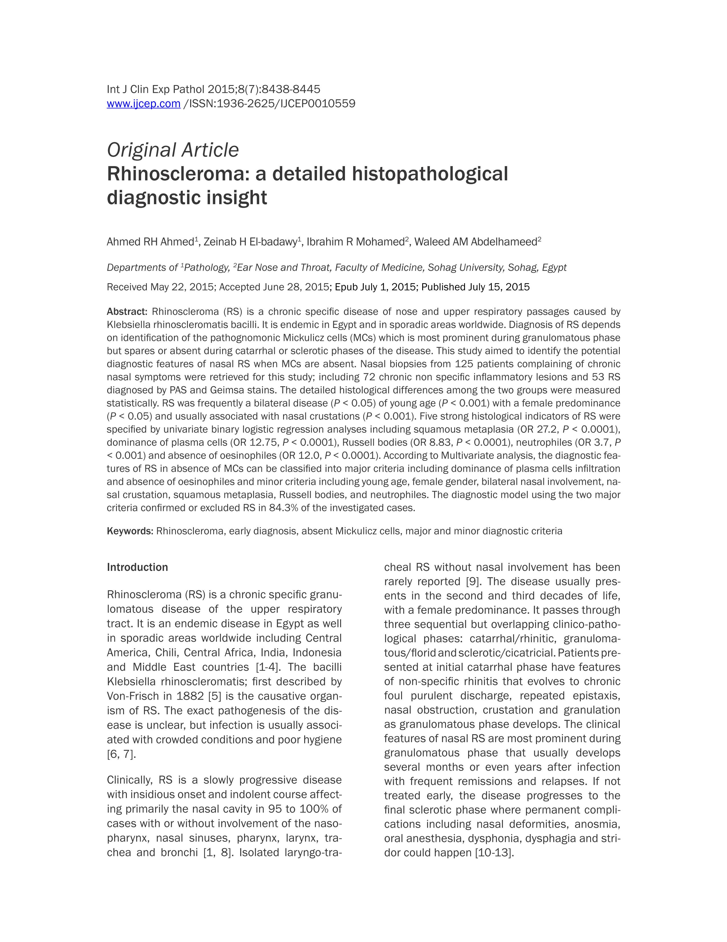 Abstract: Rhinoscleroma (RS) is a chronic specific disease of nose and upper respiratory passages caused by Klebsiella rhinoscleromatis bacilli. It is endemic in Egypt and in sporadic areas worldwide. Diagnosis of RS depends on identification of the pathognomonic Mickulicz cells (MCs) which is most prominent during granulomatous phase but spares or absent during catarrhal or sclerotic phases of the disease. This study aimed to identify the potential diagnostic features of nasal RS when MCs are absent. Nasal biopsies from 125 patients complaining of chronic nasal symptoms were retrieved for this study; including 72 chronic non specific inflammatory lesions and 53 RS diagnosed by PAS and Geimsa stains. The detailed histological differences among the two groups were measured statistically. RS was frequently a bilateral disease (P < 0.05) of young age (P < 0.001) with a female predominance (P < 0.05) and usually associated with nasal crustations (P < 0.001). Five strong histological indicators of RS were specified by univariate binary logistic regression analyses including squamous metaplasia (OR 27.2, P < 0.0001), dominance of plasma cells (OR 12.75, P < 0.0001), Russell bodies (OR 8.83, P < 0.0001), neutrophiles (OR 3.7, P < 0.001) and absence of oesinophiles (OR 12.0, P < 0.0001). According to Multivariate analysis, the diagnostic features of RS in absence of MCs can be classified into major criteria including dominance of plasma cells infiltration and absence of oesinophiles and minor criteria including young age, female gender, bilateral nasal involvement, nasal crustation, squamous metaplasia, Russell bodies, and neutrophiles. The diagnostic model using the two major criteria confirmed or excluded RS in 84.3% of the investigated cases.