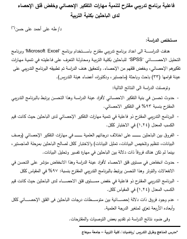 هدفت الدراسة الى اعداد برنامج تدريبي مقترح باستخدام برنامج "Microsoft Excel" وبرنامج التحليل الاحصائي "SPSS" للباحثين بكلية التربية ومحاولة التعرف على فاعليته في تنمية مهارات تفكيرهم الإحصائي، وخفض قلقهم من الإحصاء. ولتحقيق هدف الدراسة تم تطبيقه البرنامج التدريبي على عينة قوامها (33) باحث وباحثة (ماجستير، ودكتوراه، أعضاء هيئة التدريس).