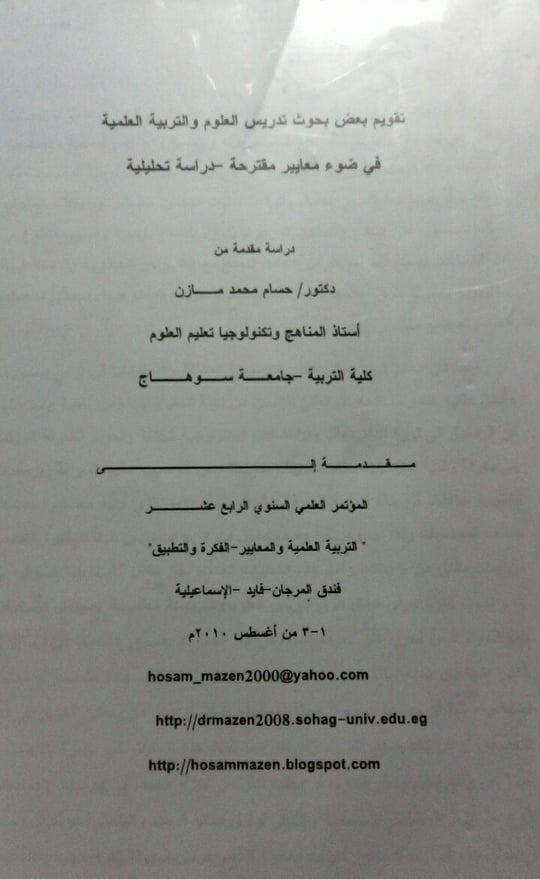 تقويم بحوث التربية العلمية وطرق تدريس العلوم خلال عشر سنوات سابقة في ضوء معايير مقترحة من الباحث