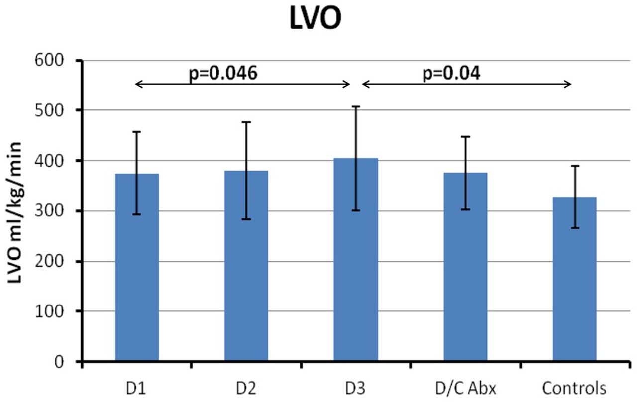 Methods Left (LVO) and right ventricular output (RVO), and superior vena cava (SVC) flow were measured using echocardiography in newborn infants with suspected sepsis after DOL 7. Measurements were repeated 3 times q 24 h and when antibiotics were discontinued. Anterior cerebral artery RI and oxygenation of the brain and the kidney were measured by near infrared spectroscopy (NIRS). Vital parameters were monitored. Controls were studied once; matched with cases for GA, BW, and postnatal age.