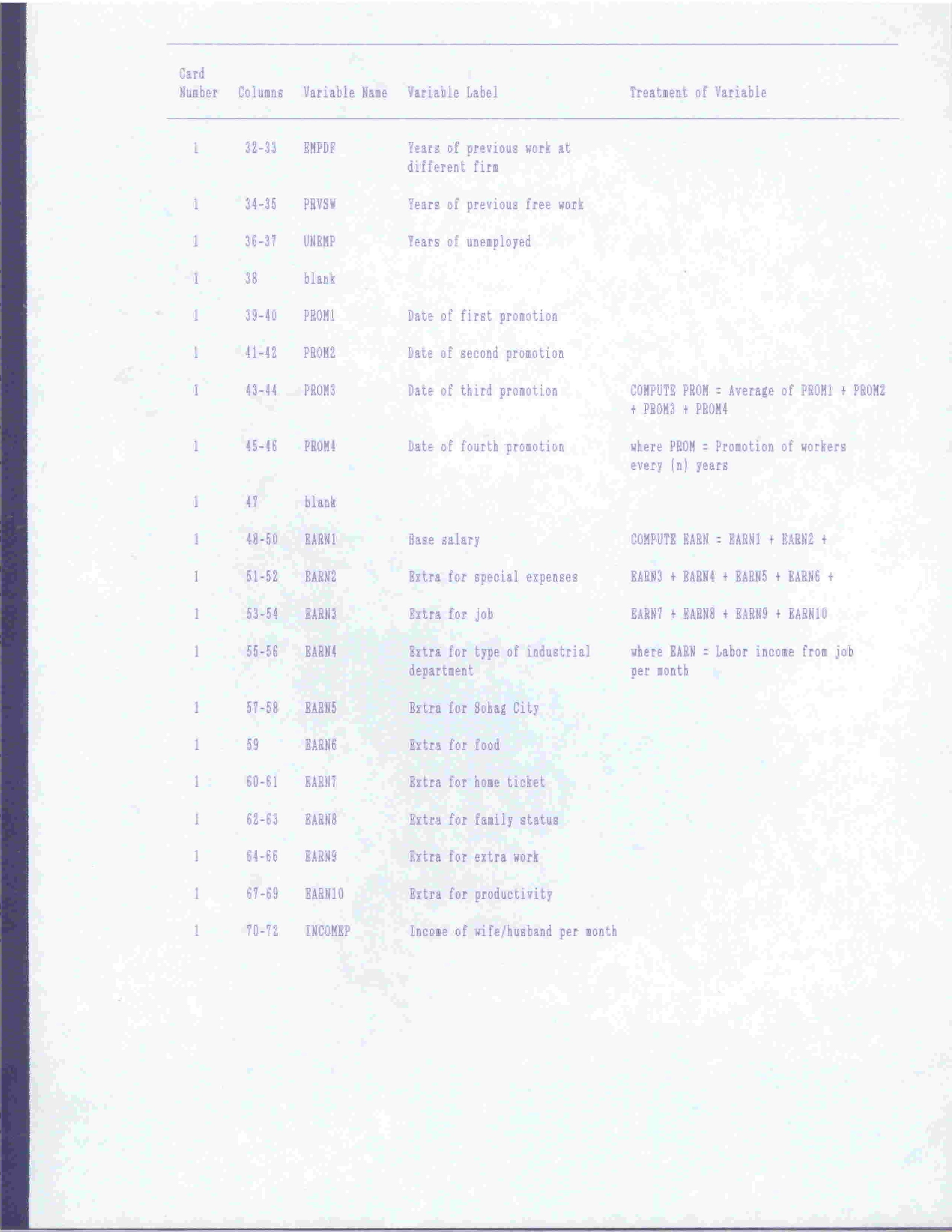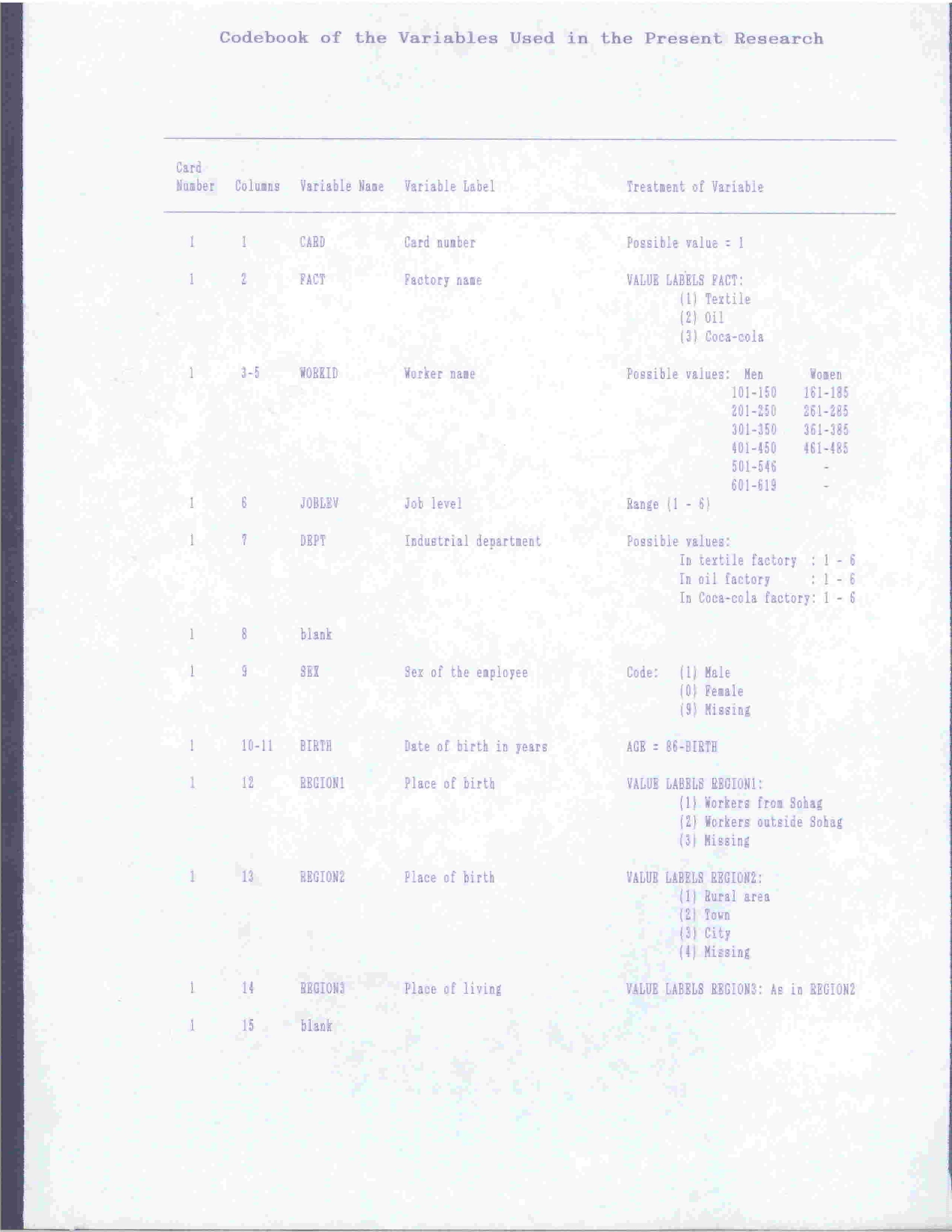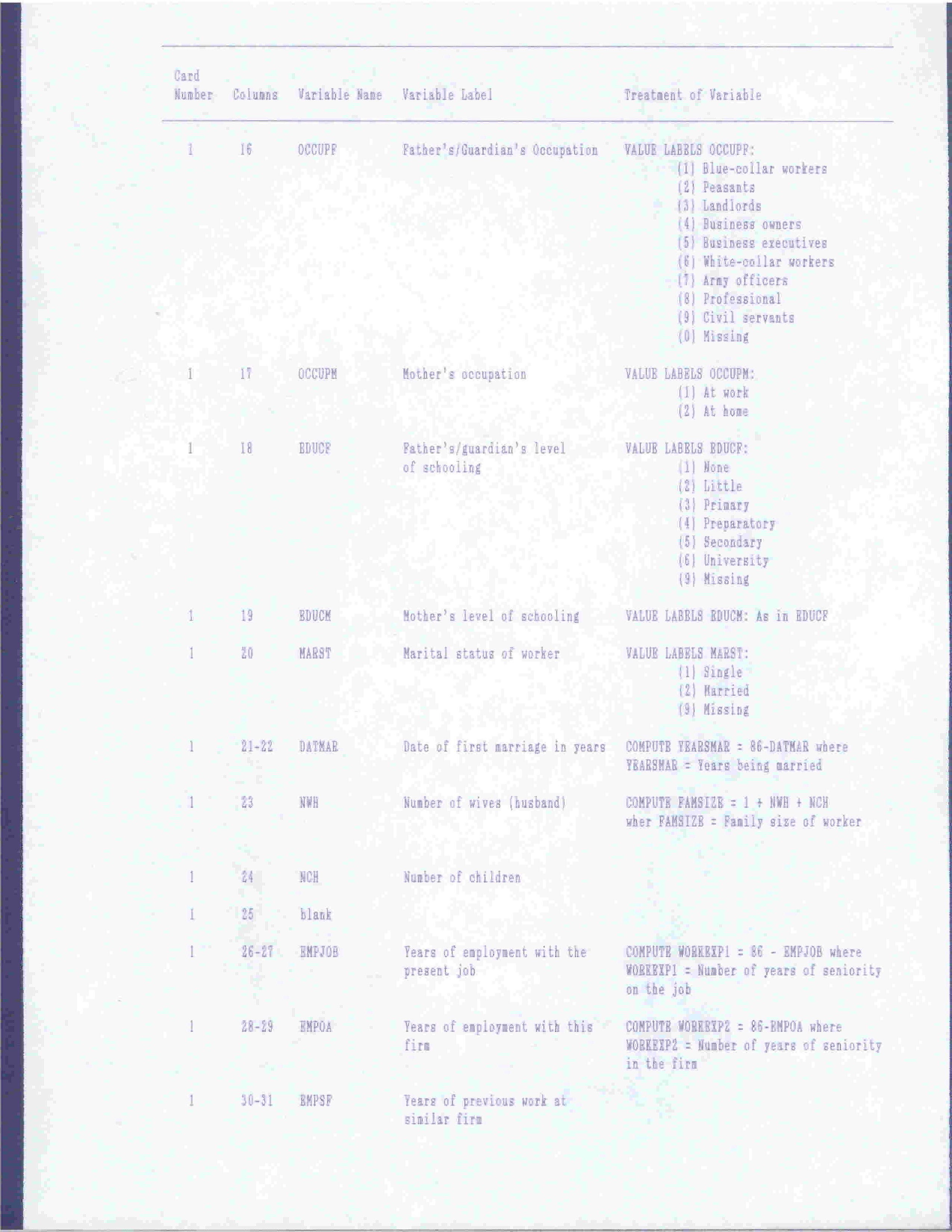 Codebook of The Variables Used in The Study of Returns of Education on Labor Market