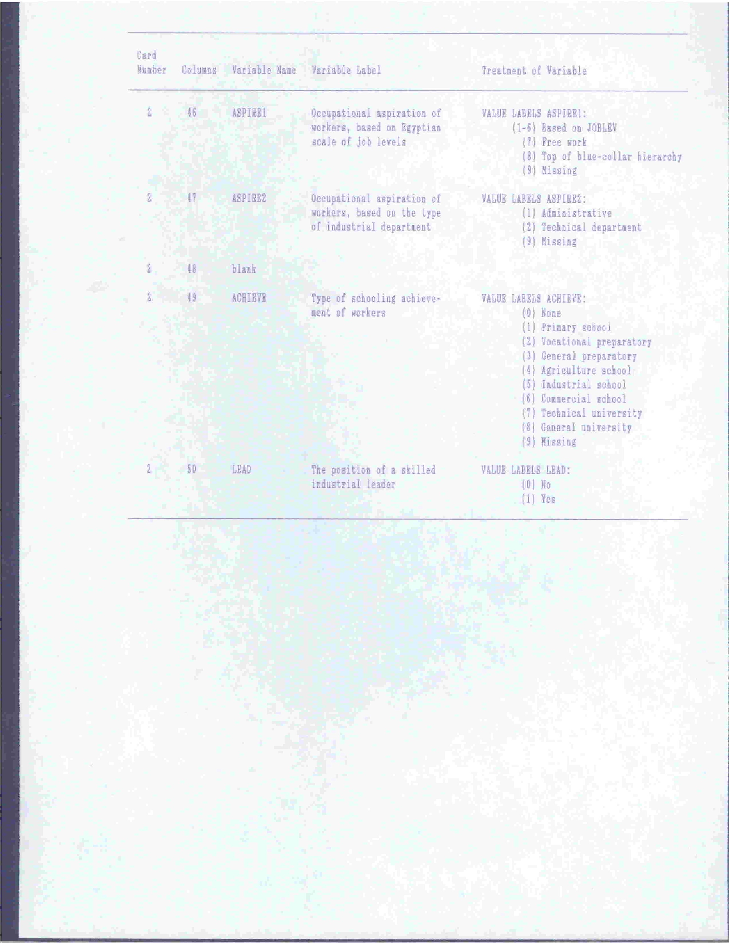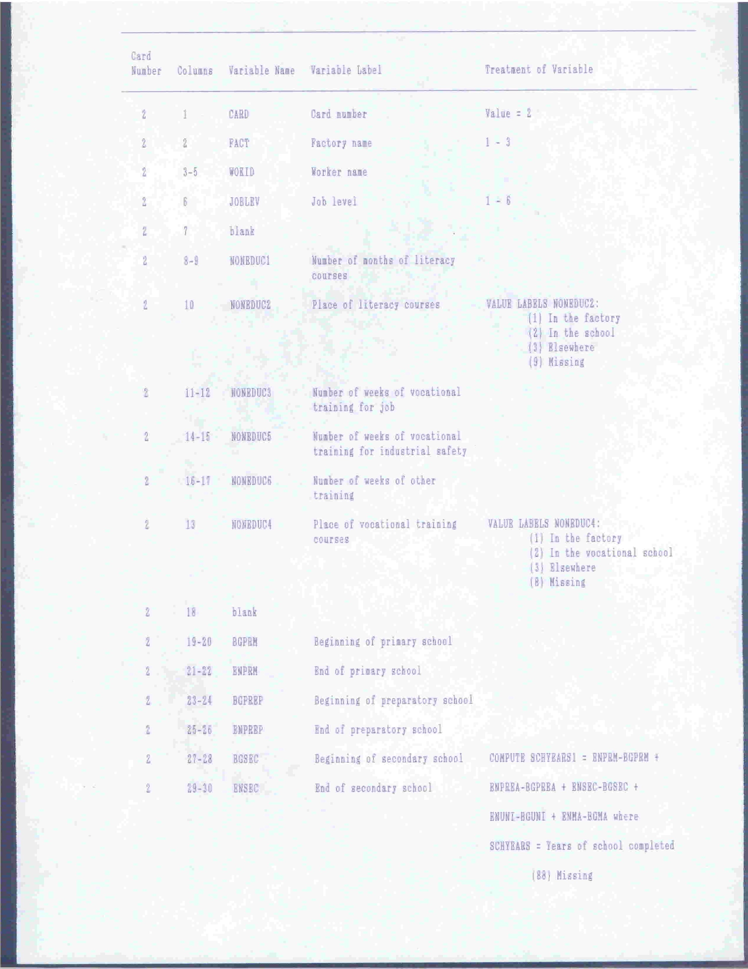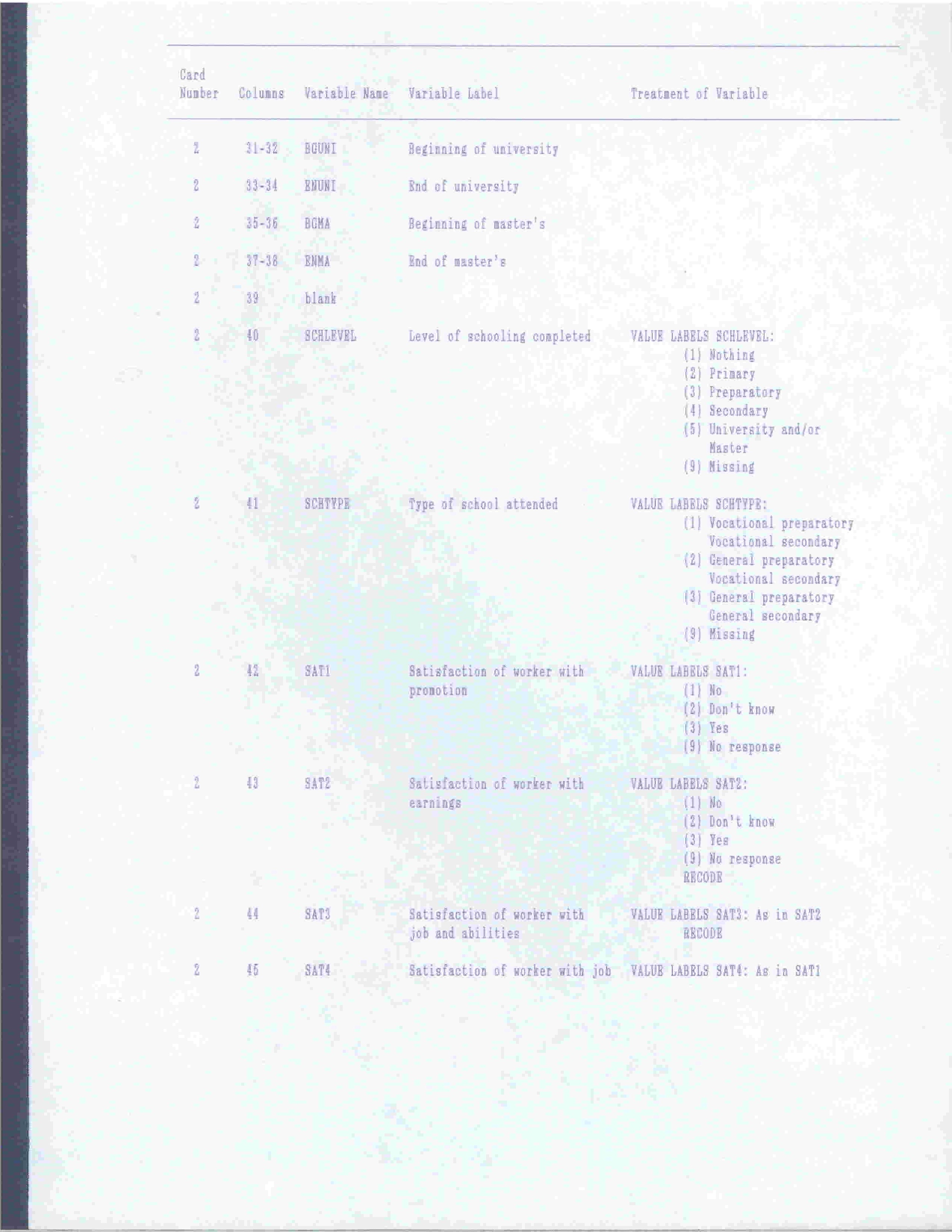 Codebook of The Variables Used in The Study of Returns of Education on Labor Market