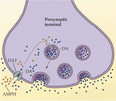 It exerts its effects in the CNS by releasing NE from their storage sites in nerve terminals. In addition, it inhibits the neuronal dopamine transporter (DAT) (which responsible for uptake of dopamine away from synaptic cleft thus terminating the signal of the neurotransmitter), so amphetamine increase dopamine level in CNS. The vesicular monoamine transporter 2 (VMAT2) is another site of action.