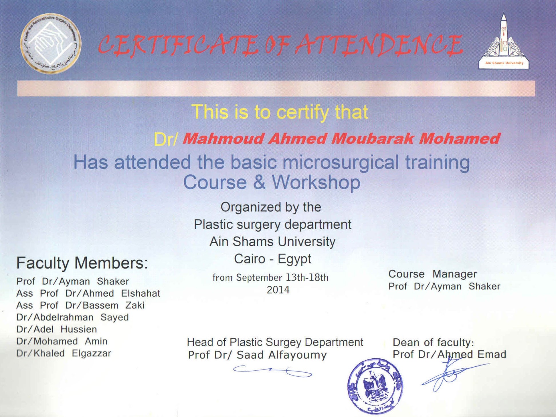The basic skills of microsurgical anastomosis under supervision of proff Ayman aboelmakarem at Ain Shams University