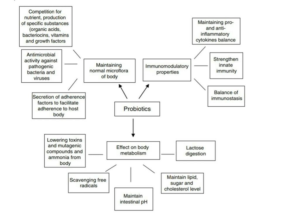 Health benefits of consuming probiotics: Probiotics effects host body metabolism, maintaining normal microflora and ensuring the integrity of immune system.