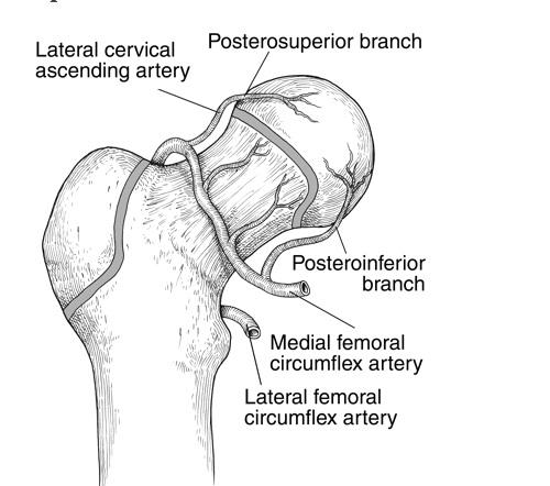 - main supply to femoral head is deep branch of the medial femoral circumflex artery
