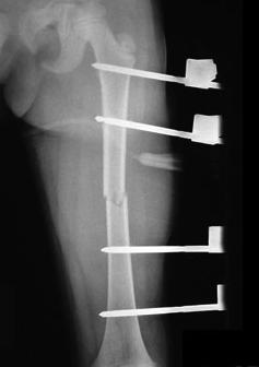 - favorable time to union, weight bearing, hardware irritation, and limp outcomes