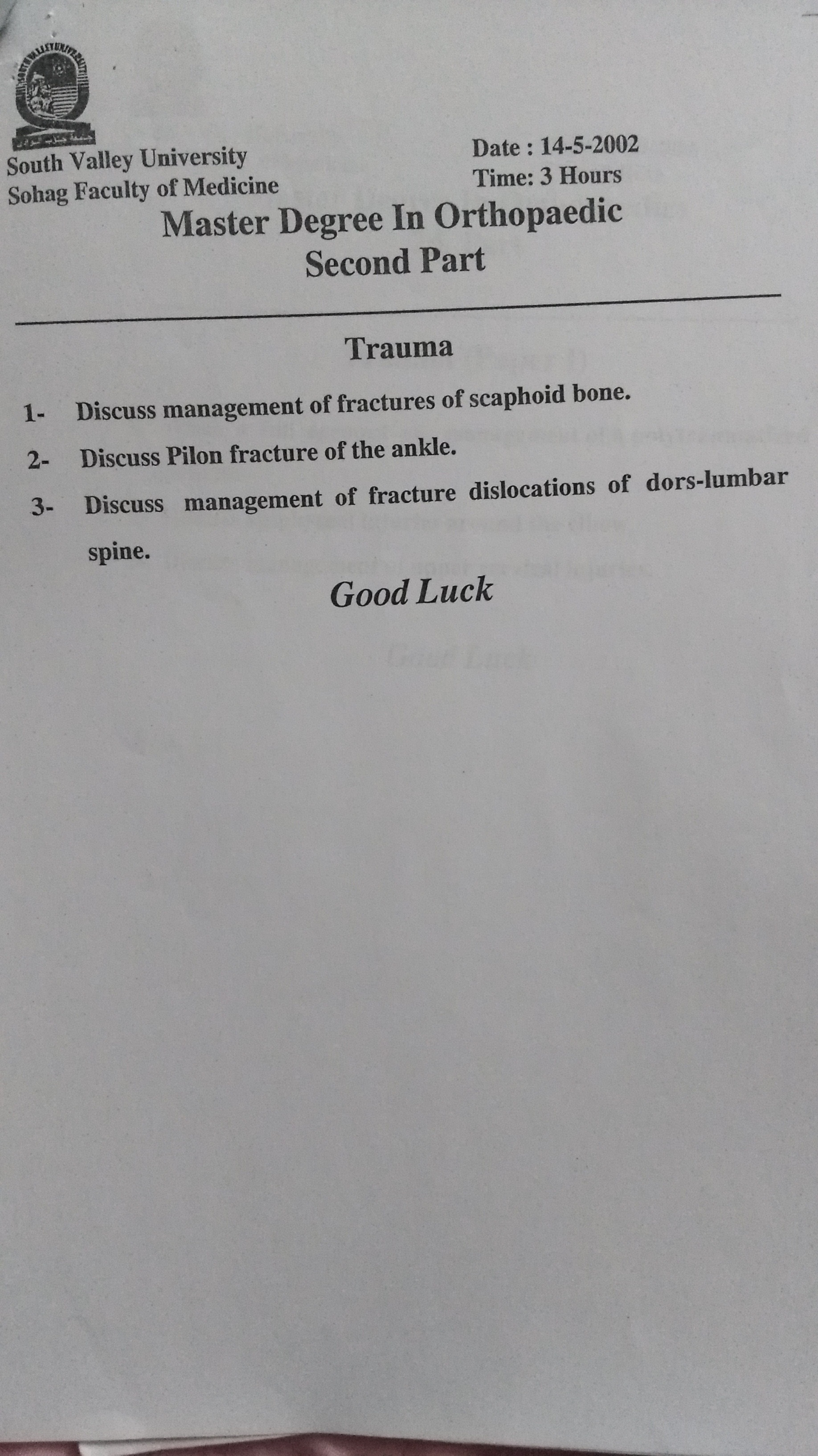امتحان ماجستير جراحة العظام (علم الاصابات) - 2002ذ