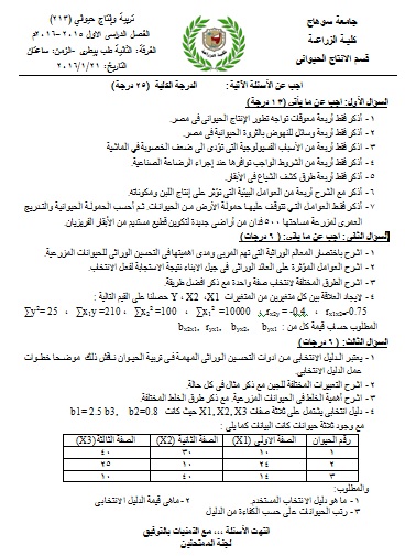 إمتحان تربية وإنتاج حيوانى - الفرقة الثانية كلية الطب البيطرى - 2015-2016